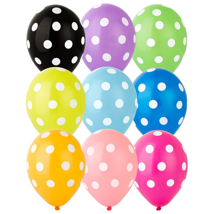 Высококачественный шар из натурального латекса. Ассорти из 6-8 цветов в случайном соотношении), одного типа - пастель - матовый оттенок цвета. Шары с пятисторонним - круговая печать, шелкографическим рисунком "Горошек". Предназначен для розничной продажи воздушных шариков. Идеальный ассортимент для праздничных оформлений, т.к. при плетении из него гирлянд - рисунок будет очень хорошо виден. Идеальный ассортимент для розничной продажи воздушных шариков. Воздушные шары изготавливаются из экологически безопасного 100%-ного натурального латекса. В окружающей среде разлагаются на безопасные компоненты примерно с той-же скоростью, как обычные листья деревьев. После использования лопнуть и утилизировать как бытовой отход.