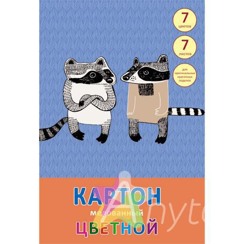 Набор цветного-мелованного картона 7л.7цв. Формат 200х280 мм., Деловые еноты