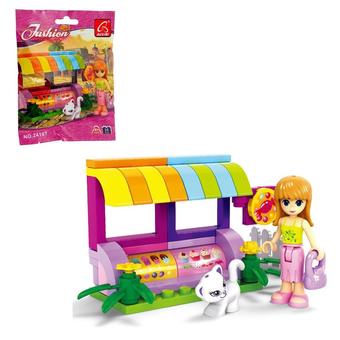 Набор содержит 39 деталей и позволяет сконструировать прилавок с рекламной вывеской, котёнка, аксессуары и фигурку девочки.
