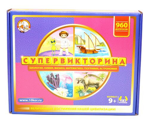 Настольная игра «Супервикторина» расширяет кругозор, тренирует память, развивает эрудицию и мышление, знакомит с интересными научными фактами и величайшими достижениями нашей цивилизации.