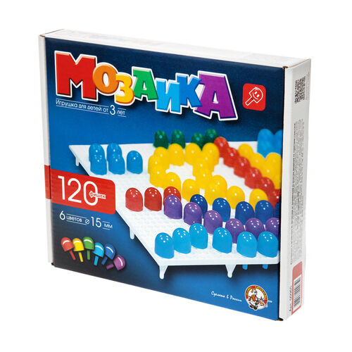 Мозаика пластмассовая: Тип мозаики - круглая 15 мм на ножке Количество мозаик - 120 шт Количество цветов - 6 Поле (плата) 220х160х35 мм - 1 шт Размеры, см: 23х20х4,3