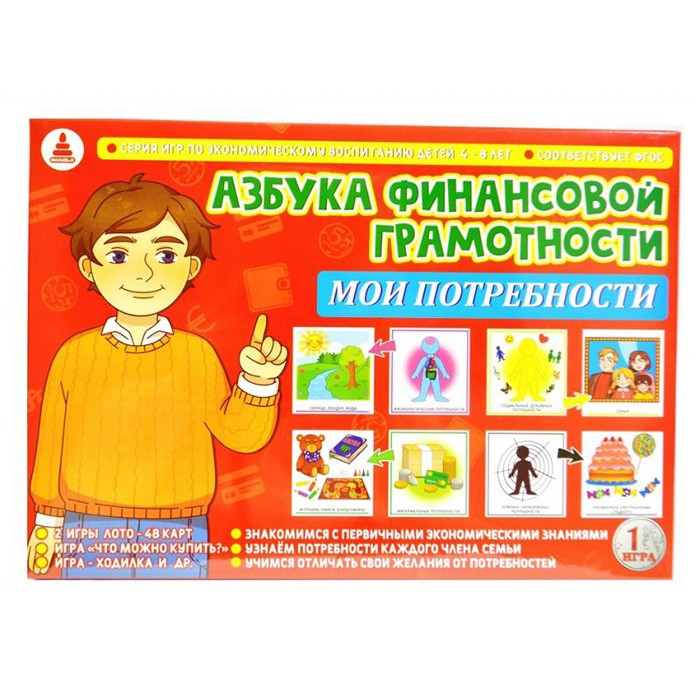 Тема экономической грамотности детей сейчас очень актуальна. Наши дети являются непосредственными участниками финансовых отношений в семье. Игра "Азбука финансовой грамотности" поможет познакомить детей с первичными экономическими знаниями, научиться оличать желания от потребностей, воспитать и сформировать у детей разумные потребности. Возраст: 4+