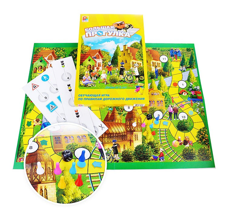 Благодаря настольной игре «Большая прогулка» вы в увлекательной игровой форме воспитаете в ребенке культуру пешехода, а также приучите к выполнению установленных правил. Игра знакомит с Правилами дорожного движения и помогает запомнить дорожные знаки. Игроки передвигают фишки по полю и изучают пояснения к дорожным знакам. Дети узнают, как должен вести себя пешеход‚ развивают умение ориентироваться на улицах и дорогах. Победителем игры станет участник, который первый доберётся до финиша. Поле и карты изготовлены из картона, имеются пластмассовые фишки и кубик. Изображения на карточках и поле легки для восприятия даже самыми маленькими детьми. Правила содержат 9 вариантов различных игр. Набор отлично подойдет для занятий как дома, так и в детском саду или студии развития. Возраст: 4+