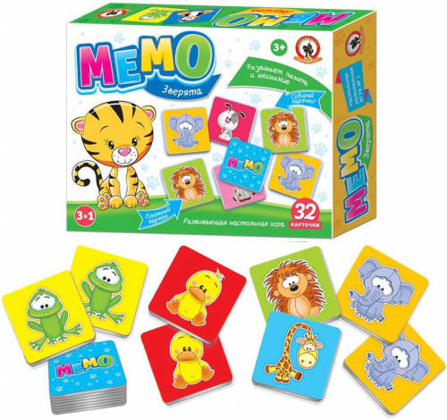 Настольная игра-мемо Зверята подарит ребенку возможность познакомиться с животными. На каждой карточке изображен тот или иной милый зверек. Суть игры заключается в следующем: игроки раскладывают «рубашкой» вверх мемо-карточки. В свой ход каждый игрок открывает наугад две картинки. Если они оказались одинаковые — он забирает их, если же нет — пытается запомнить, где и какое животное находится. Кто соберет больше всего пар одинаковых карточек, тот и победил. Игра прекрасно тренирует внимательность, сообразительность, память и воображение.