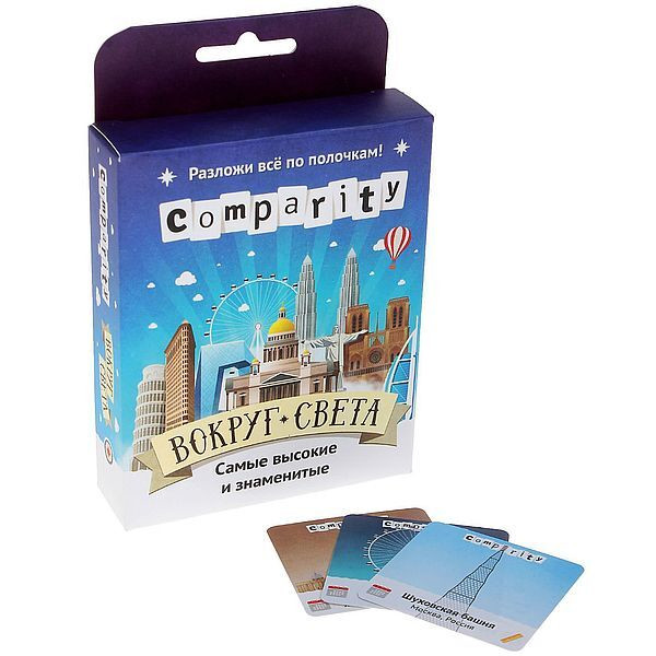 Перед вами настольная игра «Comparity Вокруг света», которая понравится детям от 12 лет и даже взрослым. На сотне карточек, входящих в состав набора, изображены достопримечательности со всего мира. А вот информация об их высоте и годе постройки, которая безусловно пригодится для победы, указана на обороте. Используя знания об аректуре, рость и умение блефовать, чтобы выиграть.
