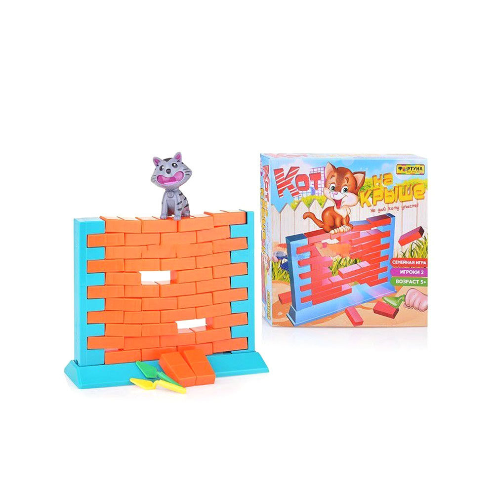 Настольная игра Игра фортуны "Кот на крыше " (Ф71778). После постройки стены игру начинает самый младший игрок. Не помогая рукой, а действуя только мастерком, нажимает на один из кирпичиков и удаляет его из стены. Далее игроки по очереди разбирают кирпичную стену при помощи мастерков. Игрок, в чей ход кот упал вниз, проиграл. Тот игрок, который разбирая стену , не дал коту упасть - победитель!