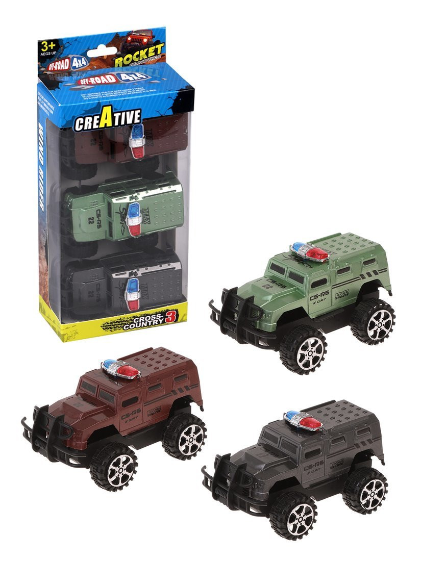 В коллекции игрушек юного автолюбителя обязательно должны появиться такие машинки! Сразу 3 игрушки! В конструкции машинок предусмотрен инерционный механизм: стоит поставить машинку на ровную поверхность, немного разогнать ее на месте поступательными движениями, а затем отпустить, как она поедет самостоятельно! Товар представлен в ассортименте. Размер машины (ДxШxВ) составляет 11х7х6 см. Изготовлено из полимерных материалов с элементами из металла. Рекомендованный возраст: 3 года +