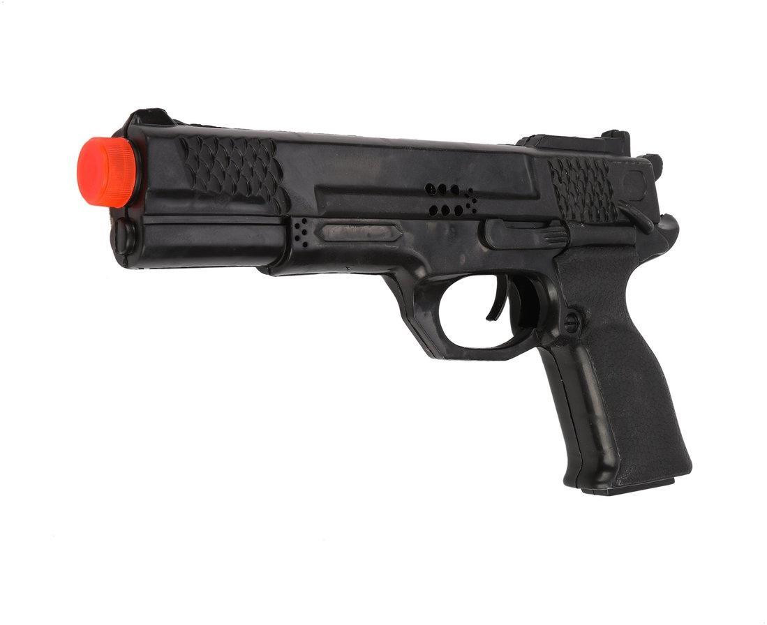 Игрушечное оружие - прекрасный подарок для маленького героя, который обожает играть в "войнушку". И игровой пистолет с трещоткой как раз может стать таким сюрпризом! Игрушка не стреляет пульками, поэтому безопасна для использования самыми маленькими детьми. При нажатии на курок слышится забавный трескучий звук. Размер пистолета (ДхШхВ) составляет 27х3х15 см. Изделие изготовлено из пластмассы. Рекомендованный возраст: 3 года +