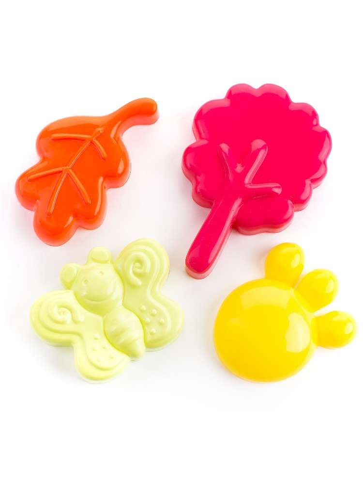 Очаровательный набор подходит по размеру и по тематике малышам от одного года. Комплект из четырех образов, где бабочка-красавица, дубовый листик, дерево и след загадочного зверя дополняют другу друга и дают возможность создать на песке интересные сюжеты и истории. Занятия делают игры с песком увлекательнее, помогают развивать фантазию и разрабатывать мелкую моторику малыша. Игрушки выполнены из качественной пластмассы, не имеют запаха и абсолютно безопасны для детей от 1-го года. Производитель: Фабрика "Росигрушка", Россия