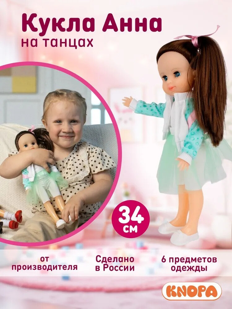 Кукла Анна на танцах - отличный подарок для ребенка на любой праздник. Кукла имеет рост 34 см, красивое классическое кукольное личико и длинные густые волосы, которые можно расчесывать и делать разнообразные прически. Одежда легко снимается и надевается. Игра с куклой совершенствует мелкую моторику и творческое воображение ребёнка, развивает эмпатию и сострадание. Кукла для девочки будет хорошим подарком на день рождения и прекрасно подойдет в качестве сюрприза на новый год или 8 марта. Эта замечательная игрушка не оставит равнодушным ни одну девочку. Её можно посадить в коляску для кукол и отправиться на прогулку или накрыть стол в кукольном домике и покормить куколку. Ручки и голова выполнены из приятного на ощупь винила, а туловище и ноги из пластмассы. Игрушка имеет все необходимые сертификаты и упакована в подарочную коробку с прозрачной крышкой.